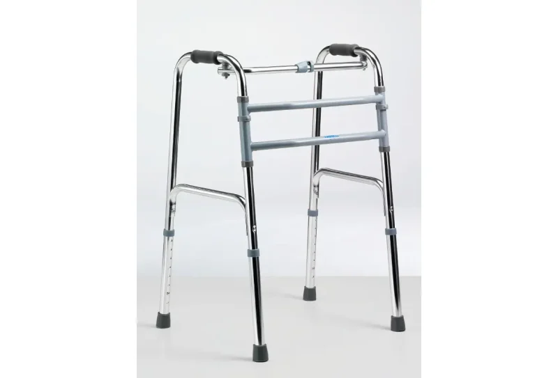 Hodulja (fiksna – recipročna) iz aluminija, z oblazinjenimi ročaji in nedrsečimi gumijastimi natiki. Hodulja je enostavno zložljiva s pritiskom na gumb.
