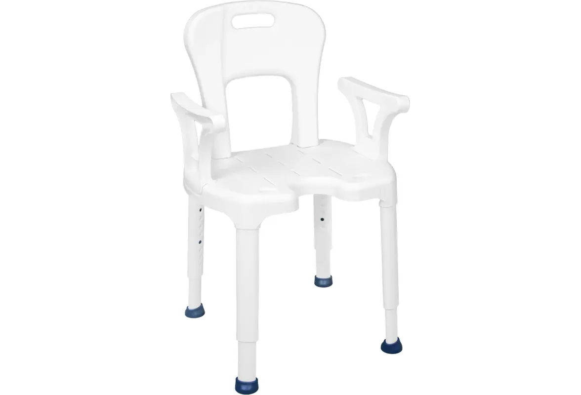 Stol ima enostavno odstranljiv naslon za hrbet in odstranljive naslone za roke ter higiensko odprtino spredaj ali zadaj. Stol je nastavljiv po višini od 38 do 55 cm.
